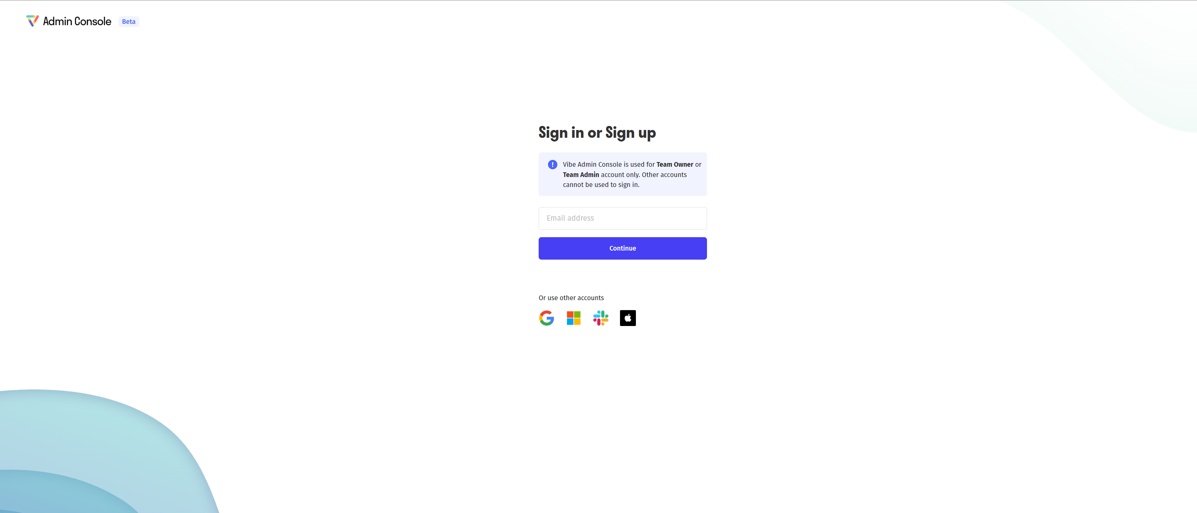 1. Go to Vibe Admin Console from your laptop and sign in or sign up with your email.