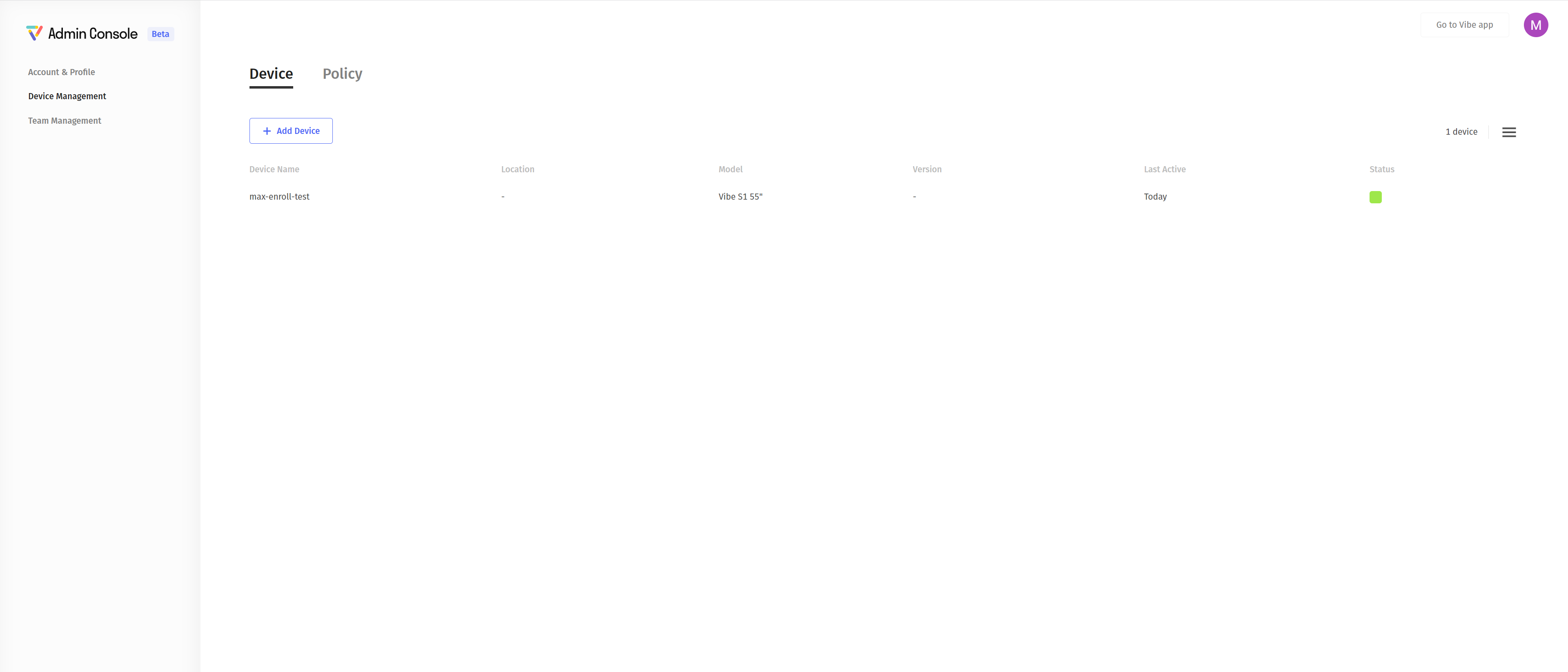 Go back to the Admin Console page from your laptop. Now you'll be able to see this Vibe Board has been enrolled under "Device Management".