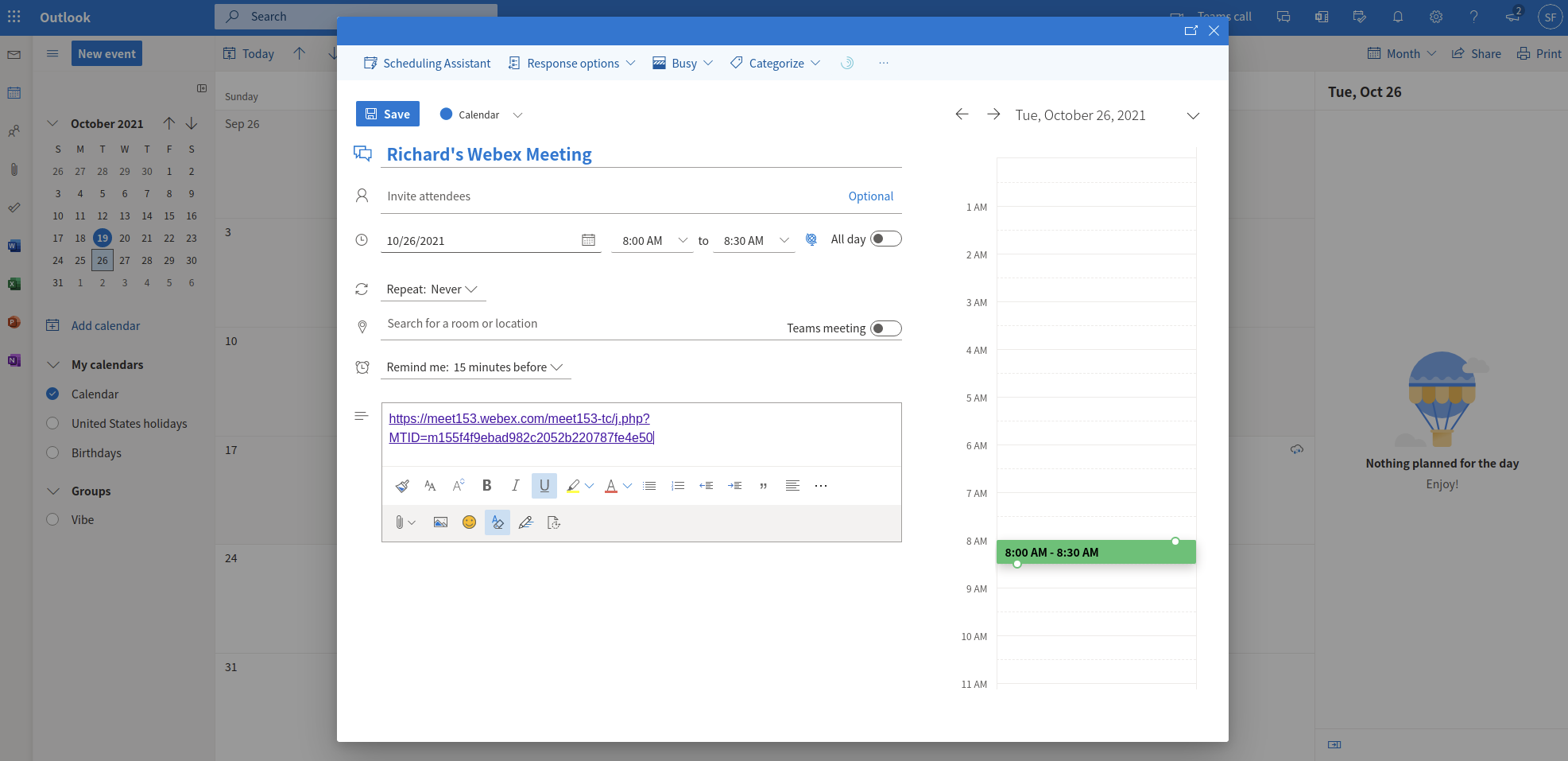 If you want to use third-party video conference apps other than Google Meet or Zoom (such as WebEx), please paste your join meeting link in Outlook Calendar.