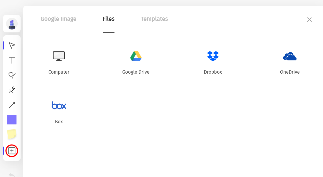 From the add menu on the Vibe toolbar, you can import image files from Google Drive, Dropbox, OneDrive, or Box directly into your Vibe canvas.
