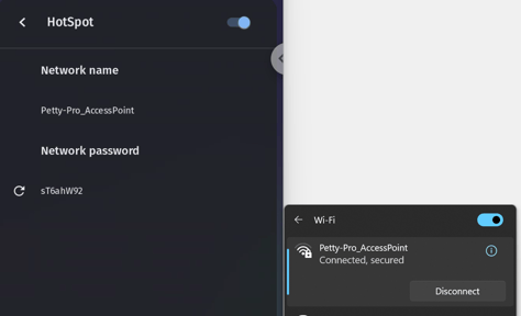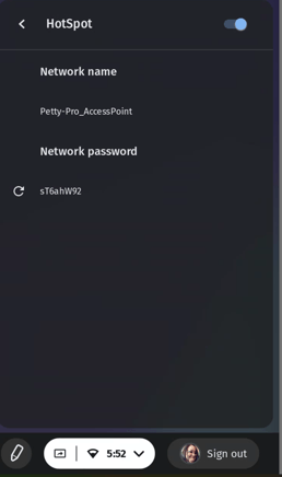 - Tap on the dropdown arrow next to HotSpot and toggle the switch to turn it on. The Network name and Network password will be displayed. Locate the hotspot from your network by the "Network name". Enter the network password to connect your device with Vibe Board HotSpot.