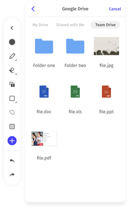 Vibe Canvas cloud drive integrations now support importing from Google Team Drives. To access or set up this feature, when you are logged into your account, go to the "+" on the whiteboard toolbar to configure your Google Drive integration.