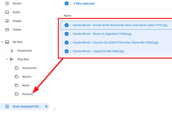 5. Highlight all the images and drag them to the Play Files -> Pictures folder