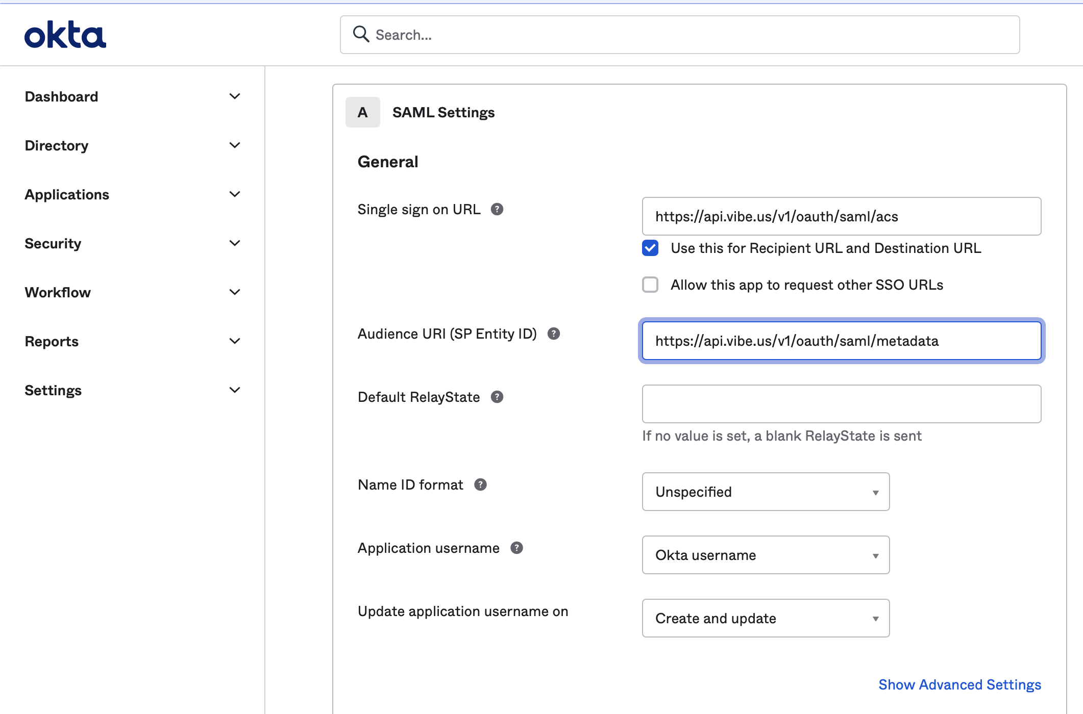 - Audience URI (SP Entity ID): https://api.vibe.us/v1/oauth/saml/metadata